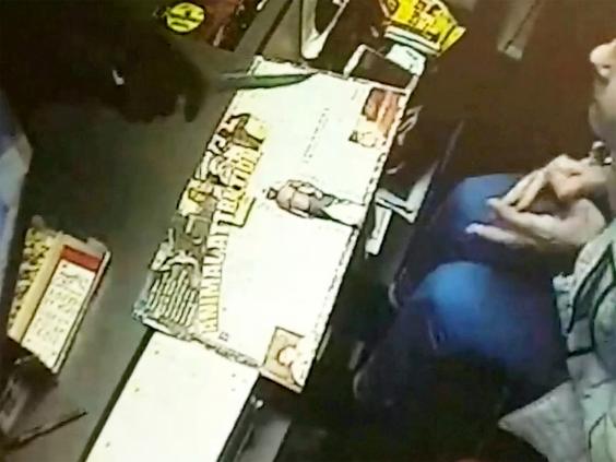The recording showed Mr Bullock sitting behind the counter on Sunday night when two men burst in demanding cash from the till.