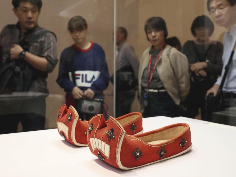 The exhibition includes "Nono Gorairi" (red leather ceremonial shoes) that are believed to had been worn by Emperor Shomu in a Buddhism ceremony in 752, and "Shitan Kinden no Egoro" (red sandalwood incense burner with long handle and gold inlay), a beautifully decorated Buddhist ritual implement. These items are associated with the Imperial household or with the ceremonies held at the Imperial Palace.