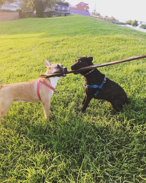We have a tendency to think of dogs as pack animals, but some research shows that they have become more dyadic since we domesticated them, Havens tells Mic, which means that they thrive in playgroups of twos. I see evidence of this in the Breakfast Club every morning. Usually, two dogs are playing intensely while the others run alongside them, barking encouragement. Stevie is usually herding the group and doesn’t love rough play. Like any animal, your dog has preferences. Rawlinson says, “Activities like parallel walks, one-on-one play, solo play with humans only, or larger play groups can all be viable activities for different dogs.”