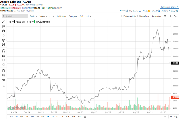 Semiconductor firm Astera Labs (ALAB) saw a sharp drop in its stock price on Oct. 14. The decline came after chip giant Advanced Micro Devices (AMD) formed a partnership with Oracle (ORCL) to deploy 50,000 GPUs starting in the second half of 2026.