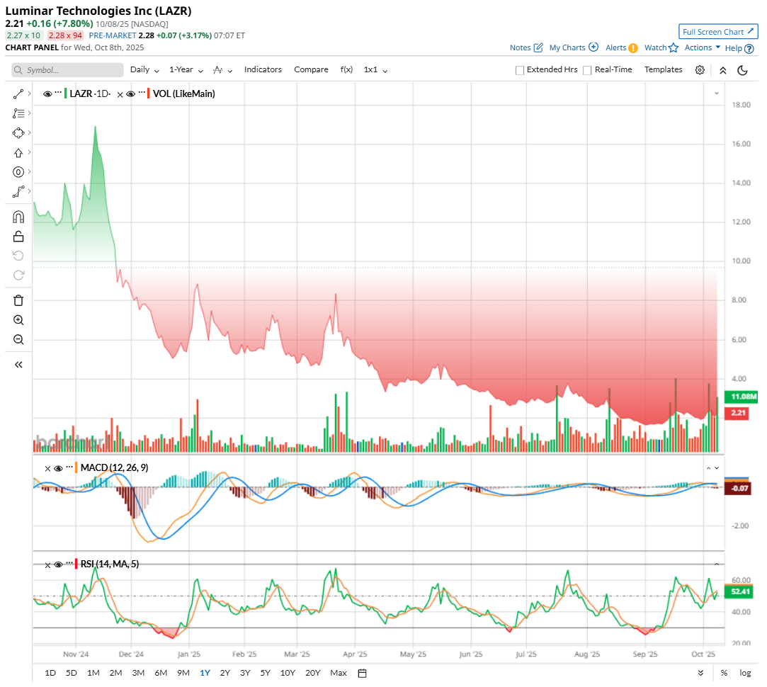 Still, lately there has been a noticeable change. LAZR stock recently bounced from its lows, ending the Oct. 8 session up by 8%. The surge came with heavy trading volumes — well above average — and even sparked chatter of a short squeeze, especially with short interest hovering around 20% of total float. LAZR also closed Oct. 13 up by 8%.