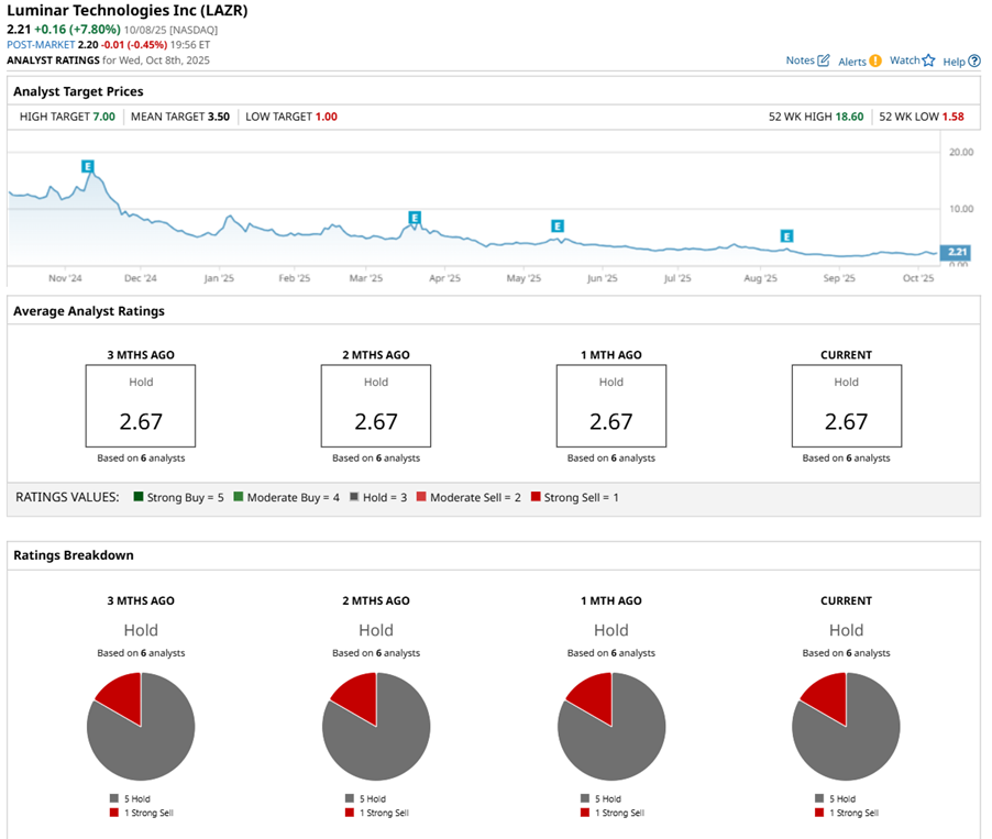 Luminar has been volatile over the past year. Back in November 2024, LAZR stock hit a 52-week high of $18.60. Fast forward to today, though, and it’s trading at $1.94 per share – an 89% drop from its high. The decline has been steep, with shares down 64% year-to-date (YTD) and 40% over the past three months, even touching a low of $1.58 on Sept. 2.