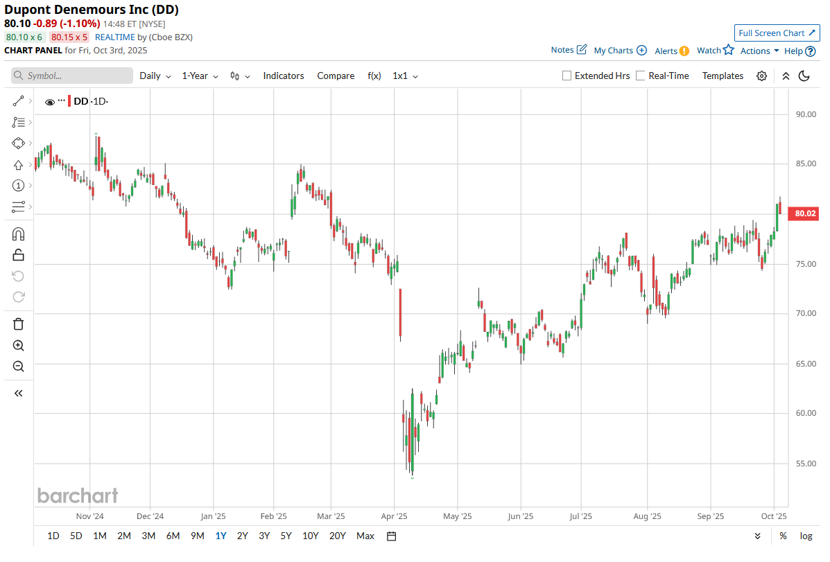DuPont has long run a broad materials business, spanning specialty chemicals and advanced solutions across electronics, water, and healthcare.DD stock has been uneven this year. Over the past 52 weeks, shares are down about 8%, reflecting broader caution around the separation, while year-to-date (YTD) they’re up 5%, pointing to a modest rebound in sentiment.