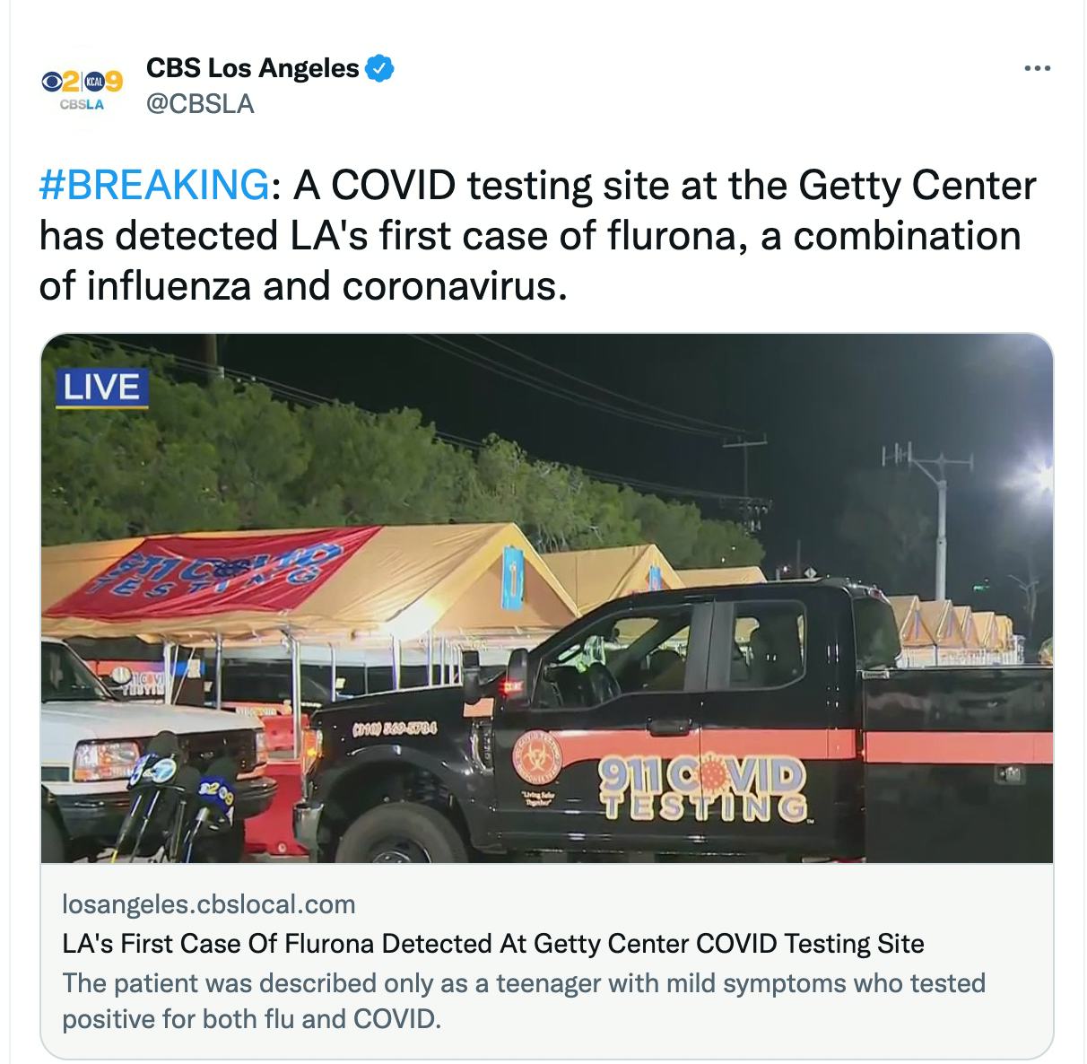 This morning, Los Angeles’ CBS affiliate tweeted “#BREAKING: A COVID testing site at the Getty Center has detected LA’s first case of flurona, a combination of influenza and coronavirus.” A combination of influenza and coronavirus?! Yet another variant with yet another name? Scary, right? Nope.