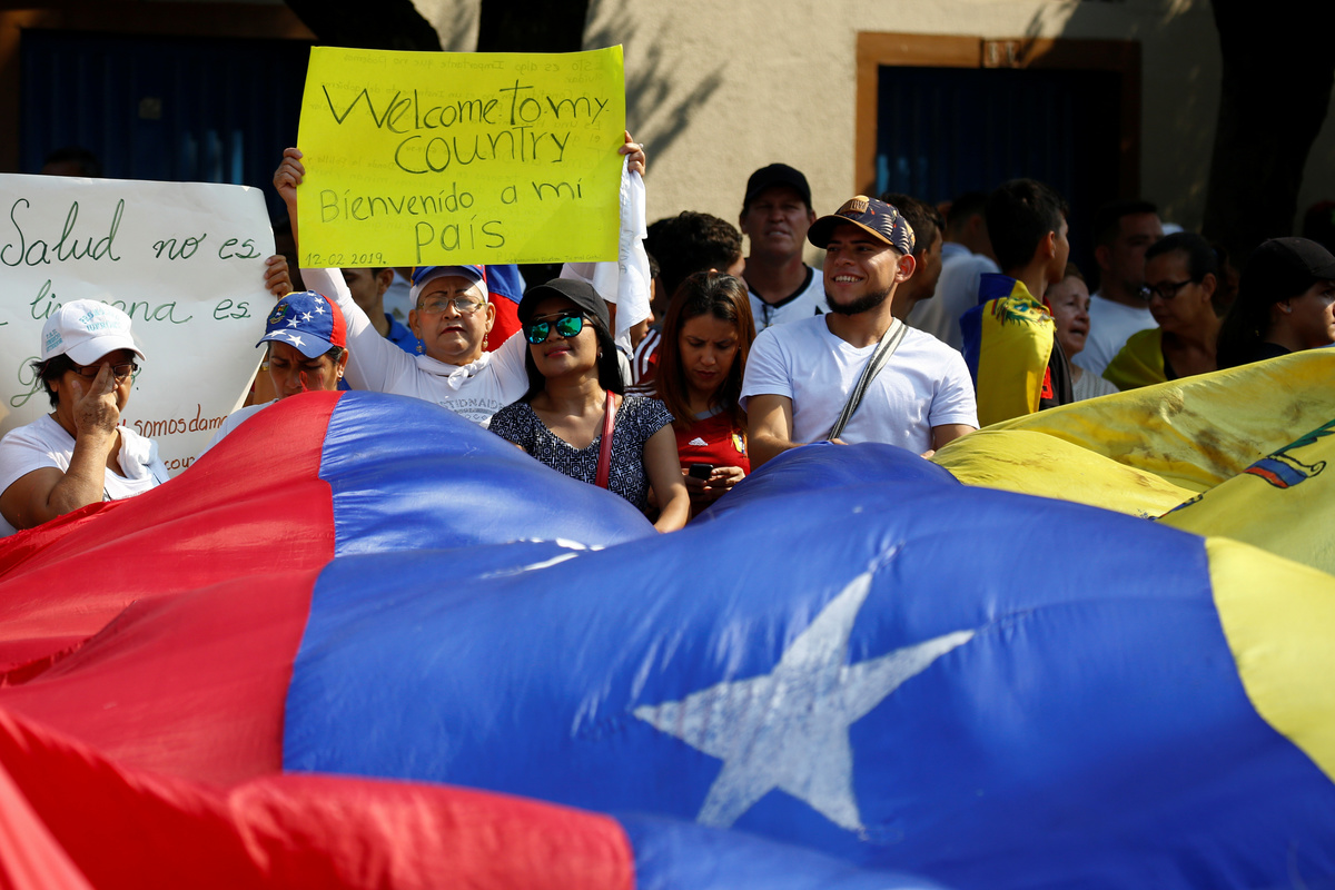 CARACAS (Reuters) - Venezuelan opposition leader Juan Guaido told a huge rally of supporters on Tuesday that humanitarian aid would enter the country on Feb. 23, setting the stage for a showdown with President Nicolas Maduro who has refused to let supplies in.