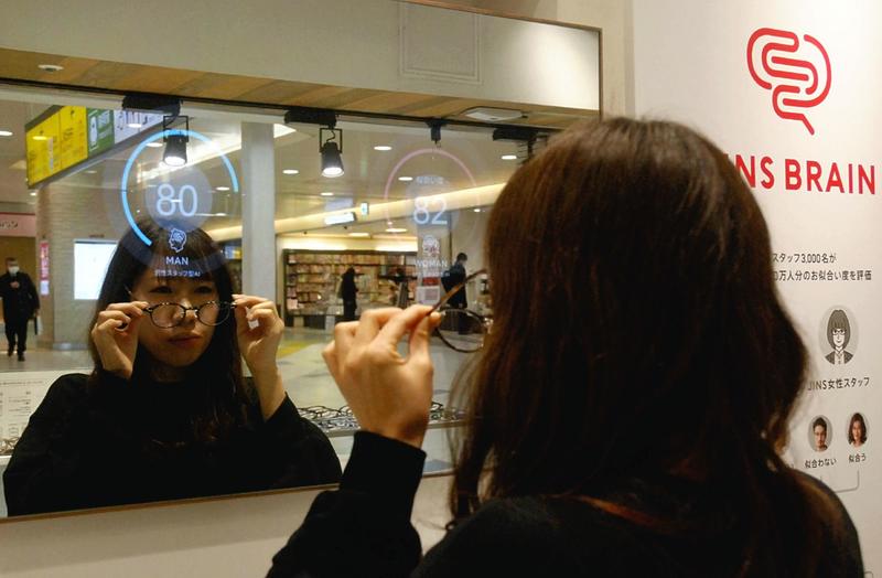 The showroom also offers another service: When a customer tries on a pair of glasses in front of a mirror, artificial intelligence gives them a score of up to 100 points based on how good they look in them. Customers can also have their eyesight checked in the store.