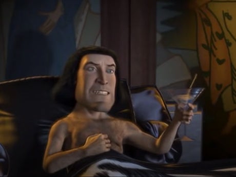 Early on in the film, Lord Farquaad is shown watching reels of Princess Fiona on the Magic Mirror, while he lies in bed with a cocktail.