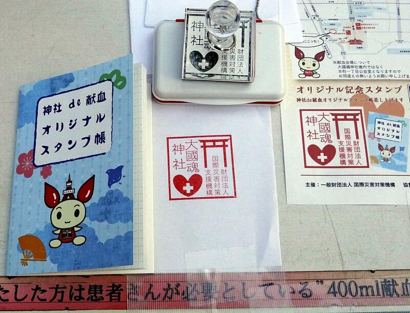 The "Jinja de kenketsu" (blood donations at shrines) campaign offers blood donors a memento in the form of a stamp notebook on which they can get an original seal featuring the campaign. The seal is quite similar to the calligraphy-style goshuin red stamps that visitors receive at shrines.