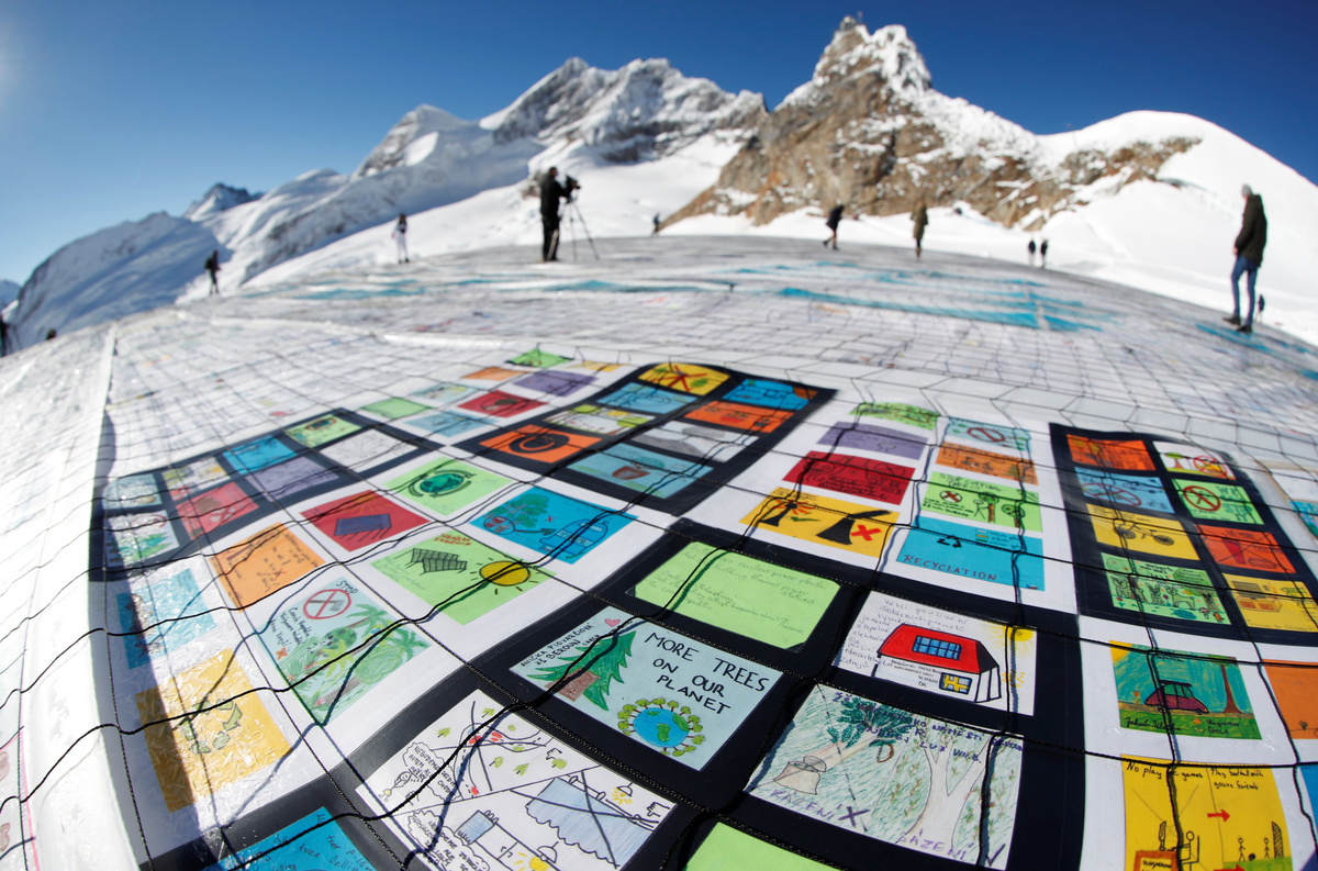 In all, 125,000 postcards with messages against climate change and sent by young people from all over the world have been assembled around 3,400 meters up on the Jungfraufirn, the upper reaches of the Aletsch glacier.