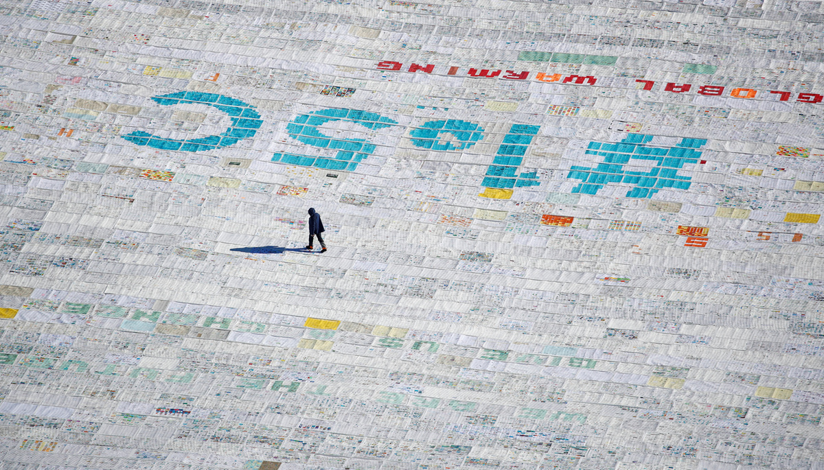 A person walks over 100,000 postcards with messages against climate change, sent by young people from all over the world and stuck together to break the Guinness World Record of the biggest postcard on the Jungfraufirn, the upper part of Europe's longest glacier, the Aletschgletscher, near Jungfraujoch, Switzerland November 16, 2018. REUTERS/Arnd Wiegmann