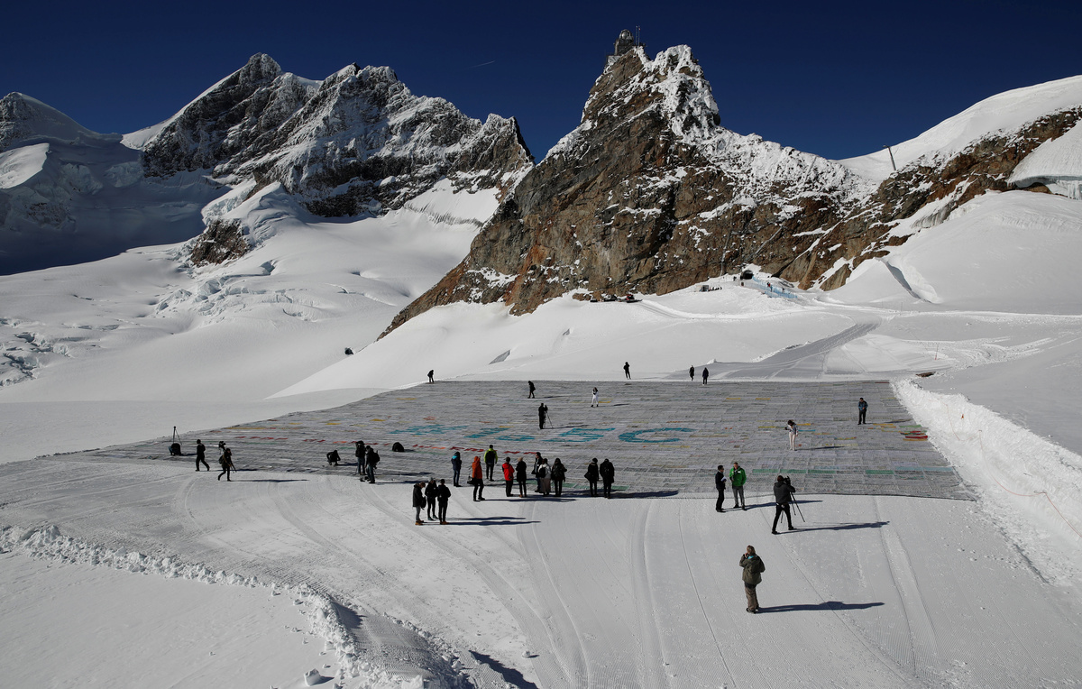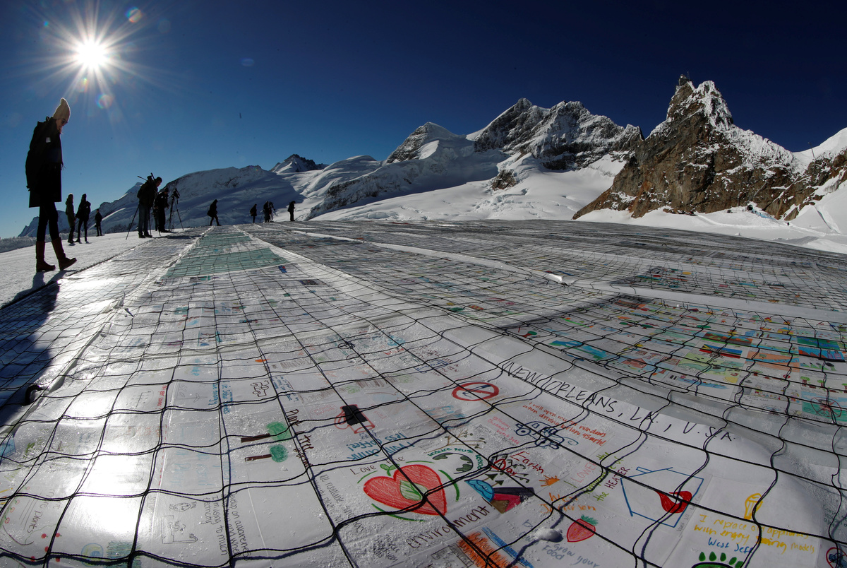 A general view shows 100,000 postcards with messages against climate change, sent by young people from all over the world and stuck together to break the Guinness World Record of the biggest postcard on the Jungfraufirn, the upper part of Europe's longest glacier, the Aletschgletscher, near Jungfraujoch, Switzerland November 16, 2018. REUTERS/Arnd Wiegmann