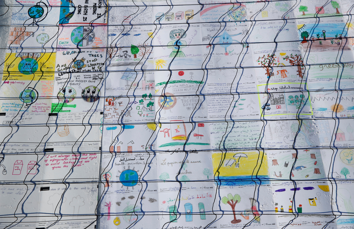 A detail view shows some of 100,000 postcards with messages against climate change, sent by young people from all over the world and stuck together to break the Guinness World Record of the biggest postcard, on the Jungfraufirn, the upper part of Europe's longest glacier, the Aletschgletscher, near Jungfraujoch, Switzerland November 16, 2018. REUTERS/Arnd Wiegmann