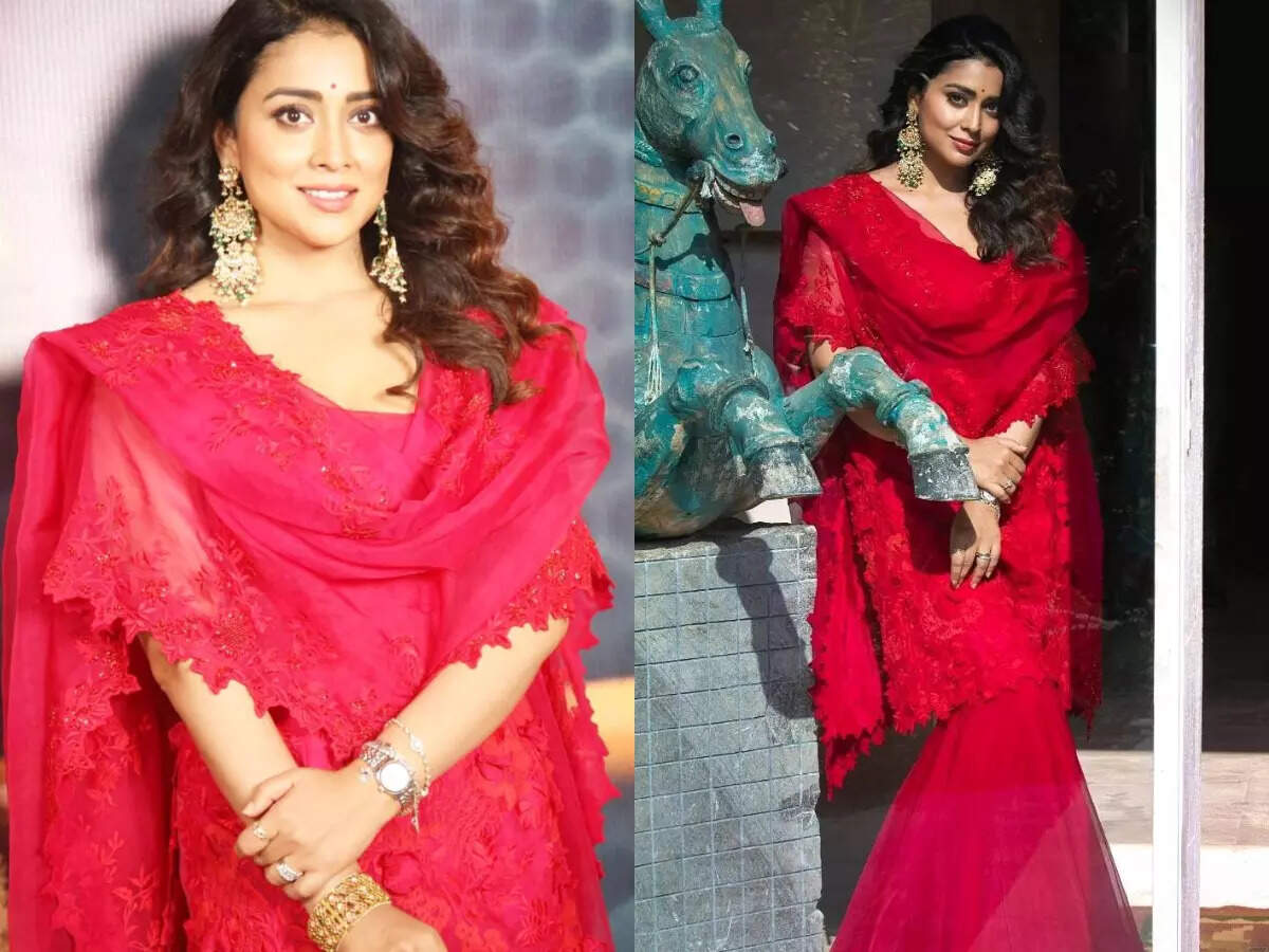 For the Gamanam press meet, South Indian star Shriya slayed in a bright red sharara set by ace designer Anushree Reddy, and if you love ethnic picks in red, you ought to have a look.