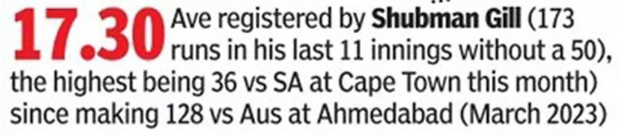 <p>Shubman Gill averages 17.30 (173 runs in his last 11 innings without a 50), the highest being 36 against South Africa at Cape Town this month) since making 128 against Australia at Ahmedabad (March 2023). </p>AFP8/10:Defeat for India