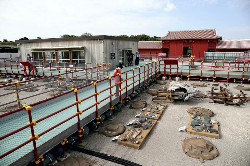Also on display along the walkway are photos from the 1992 work to restore the castle, which burned down during the Battle of Okinawa in 1945.