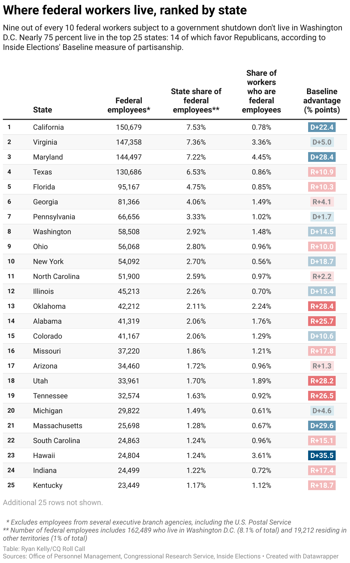 In all, CQ Roll Call found that among the top 25 states for federal workers, 14 of them lean Republican according to Inside Elections’ Baseline metric, which combines all federal and state election results over the past four election cycles into a single score.