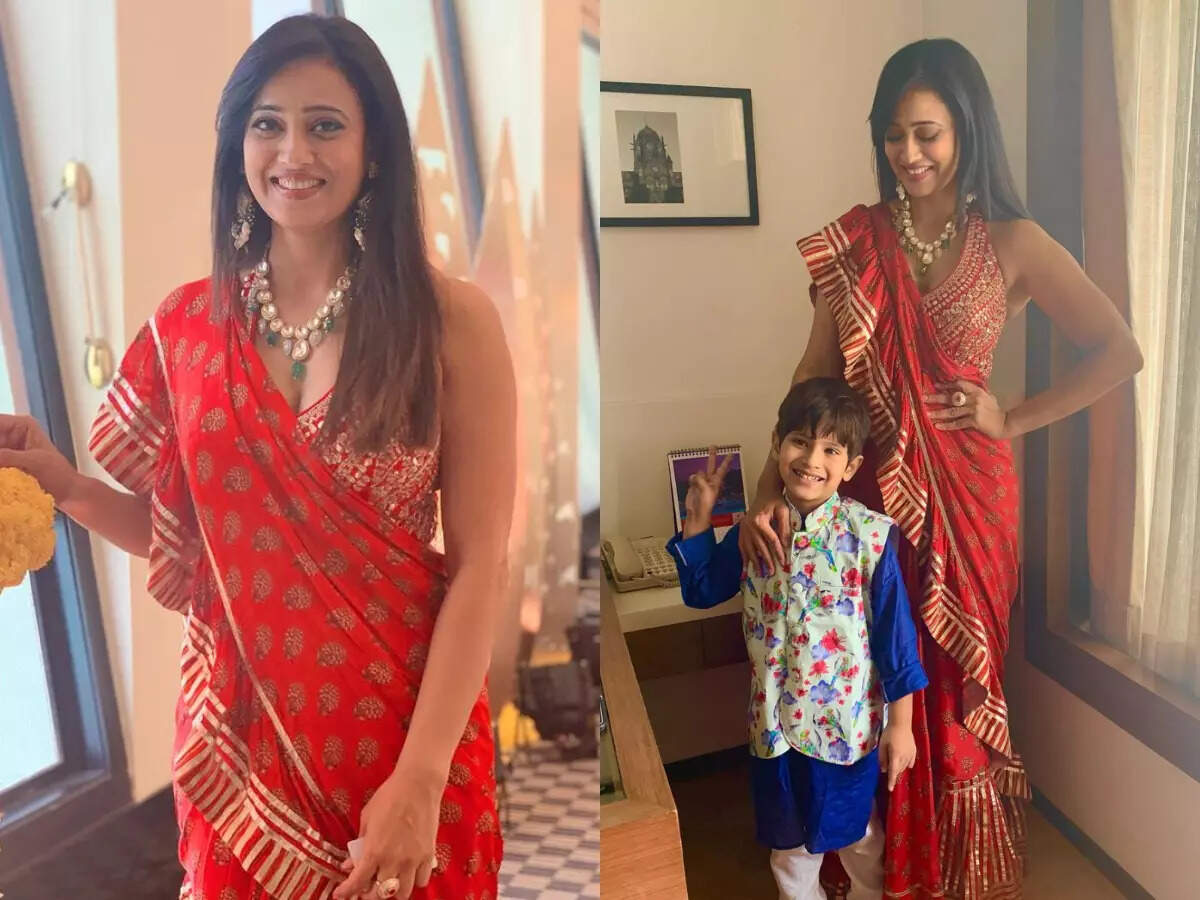 Shweta Tiwari, children Palak and Reyansh are all about #SquadGoals in these traditional outfits. The wedding season is on and Shweta posted several pictures in a bright red and gold ruffle saree.