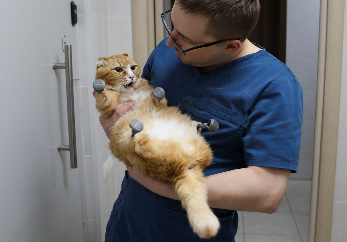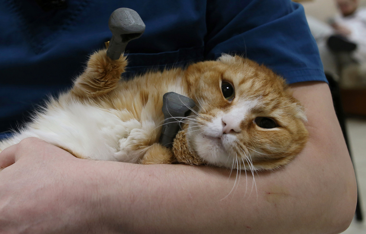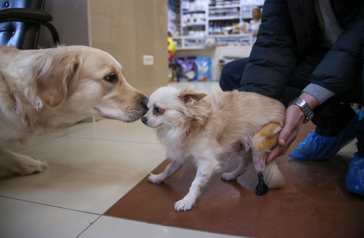 Veterinarian Sergei Gorshkov holds his patient Ryzhik the cat, who lost all four paws and got 3D-printed titanium prosthetics in 2019, at the veterinarian clinic in Novosibirsk, Russia February 2, 2020. Picture taken February 2, 2020. REUTERS/Vladislav NekrasovA Labrador sniffs Salvador the dog who got a 3D-printed prosthetic paw at the veterinarian clinic in Novosibirsk, Russia February 2, 2020. Picture taken February 2, 2020. REUTERS/Vladislav NekrasovVeterinarian Sergei Gorshkov checks Salvador the dog after adjusting a 3D-printed prosthetic paw at the veterinarian clinic in Novosibirsk, Russia February 2, 2020. Picture taken February 2, 2020. REUTERS/Vladislav NekrasovRyzhik the cat, who lost all four paws and got 3D-printed titanium prosthetics in 2019, is seen at the veterinarian clinic in Novosibirsk, Russia February 2, 2020. Picture taken February 2, 2020. REUTERS/Vladislav Nekrasov
