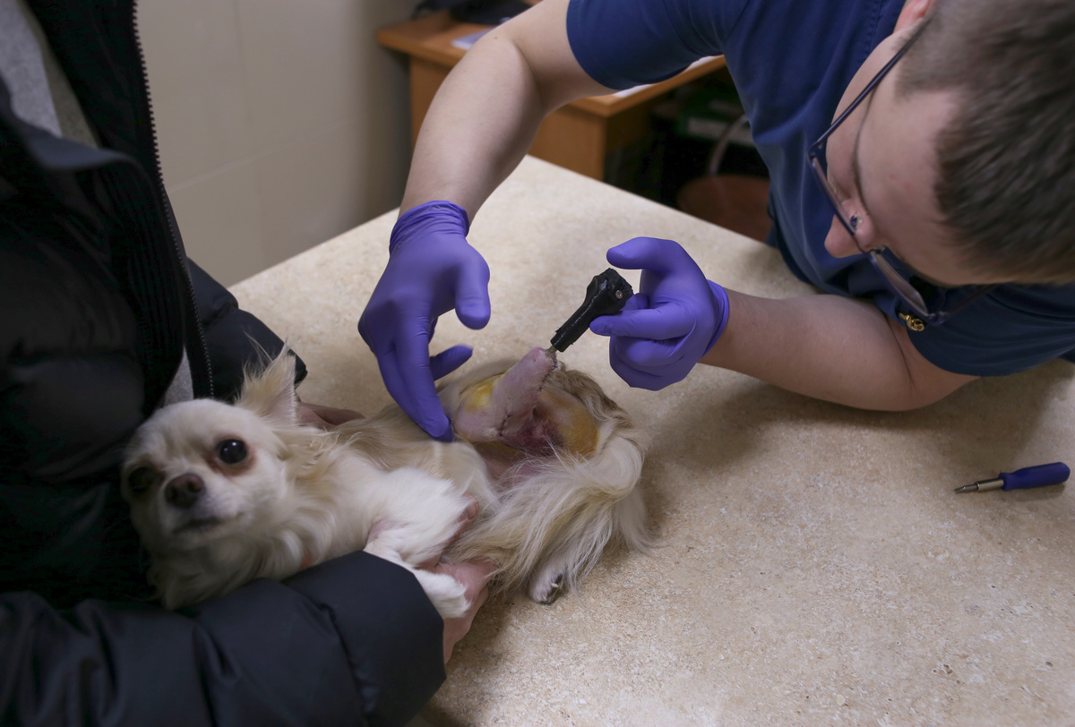 Veterinarian Sergei Gorshkov checks Salvador the dog after adjusting a 3D-printed prosthetic paw at the veterinarian clinic in Novosibirsk, Russia February 2, 2020. Picture taken February 2, 2020. REUTERS/Vladislav Nekrasov