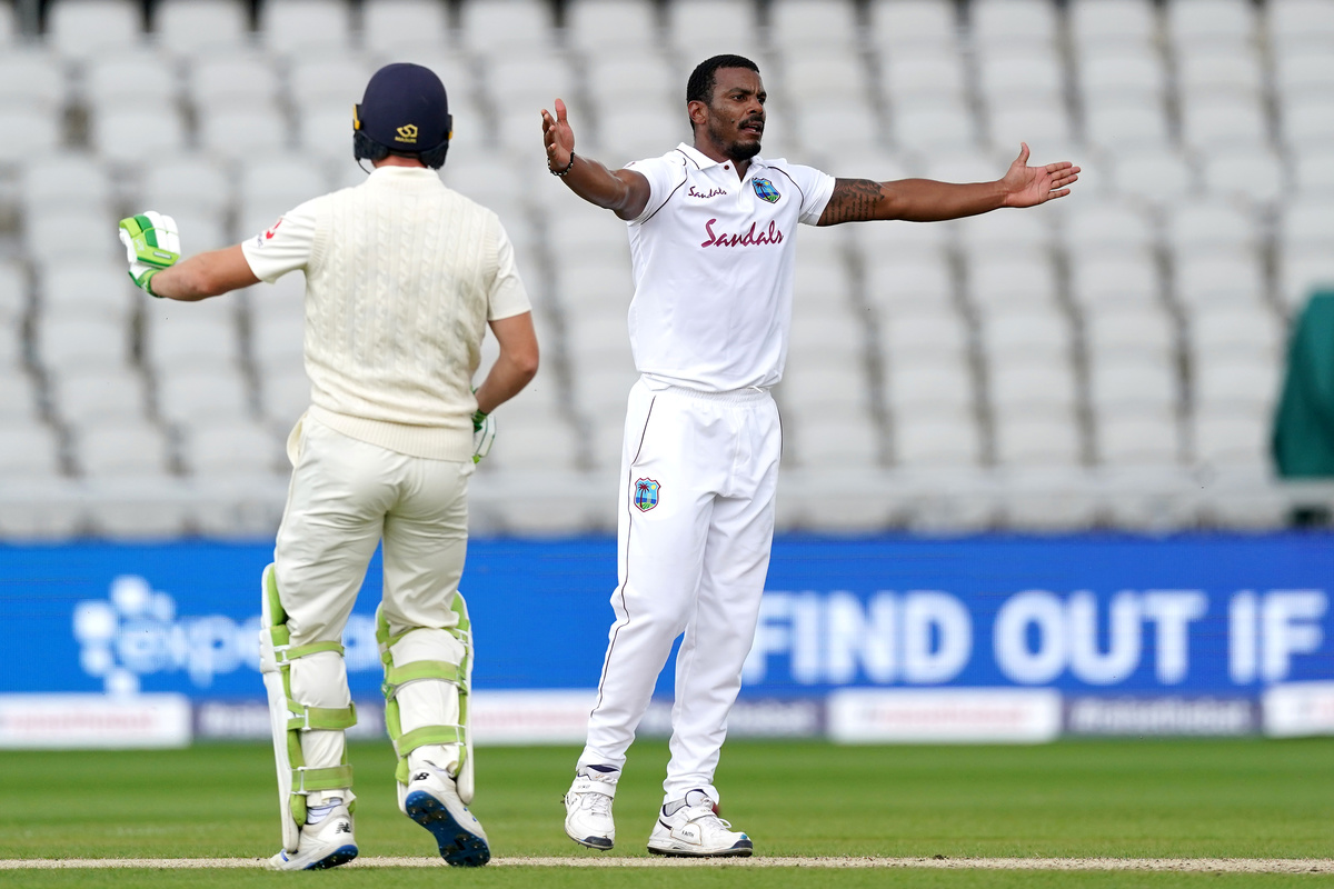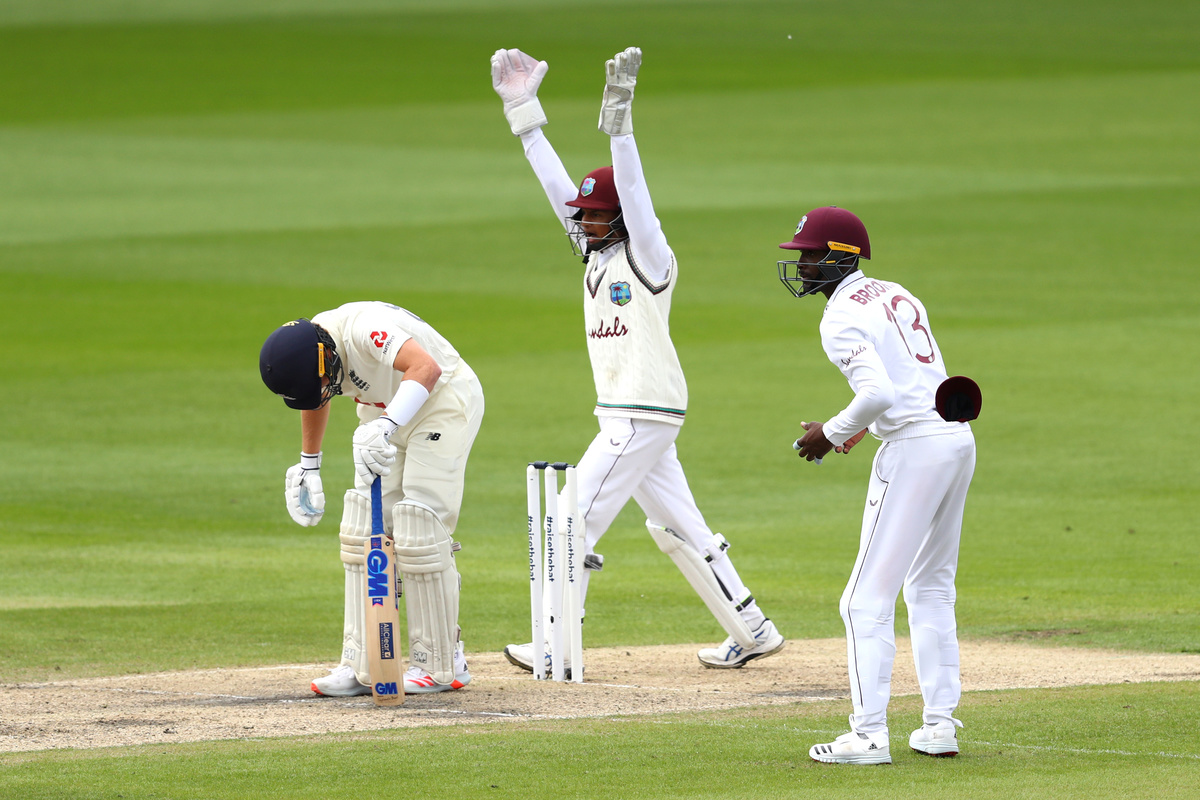 Ollie Pope missed out, scoring only seven before going lbw to Chase, but Jos Buttler made a useful 40 against a tiring West Indies attack which became a little ragged towards the end with Shannon Gabriel comically failing to run out Stuart Broad.