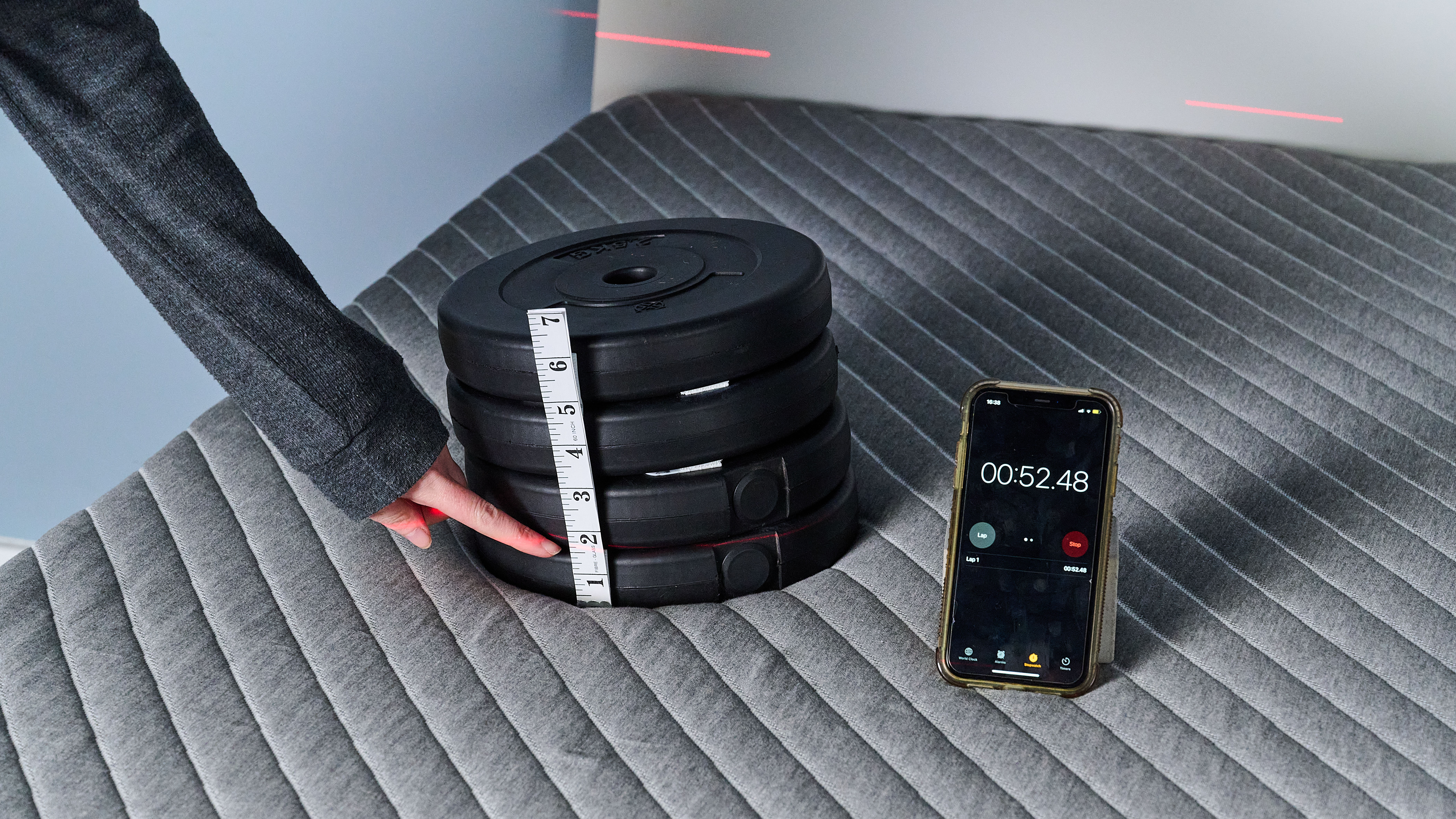 To objectively test motion isolation, we drop a 5kg slam ball on a designated area (roughly where a person would sleep) and measure the force and duration of impact with an accelerometer app, running on a smartphone strapped to the other side of the mattress (roughly where your partner would sleep.) We repeat this 10 times and take an average.