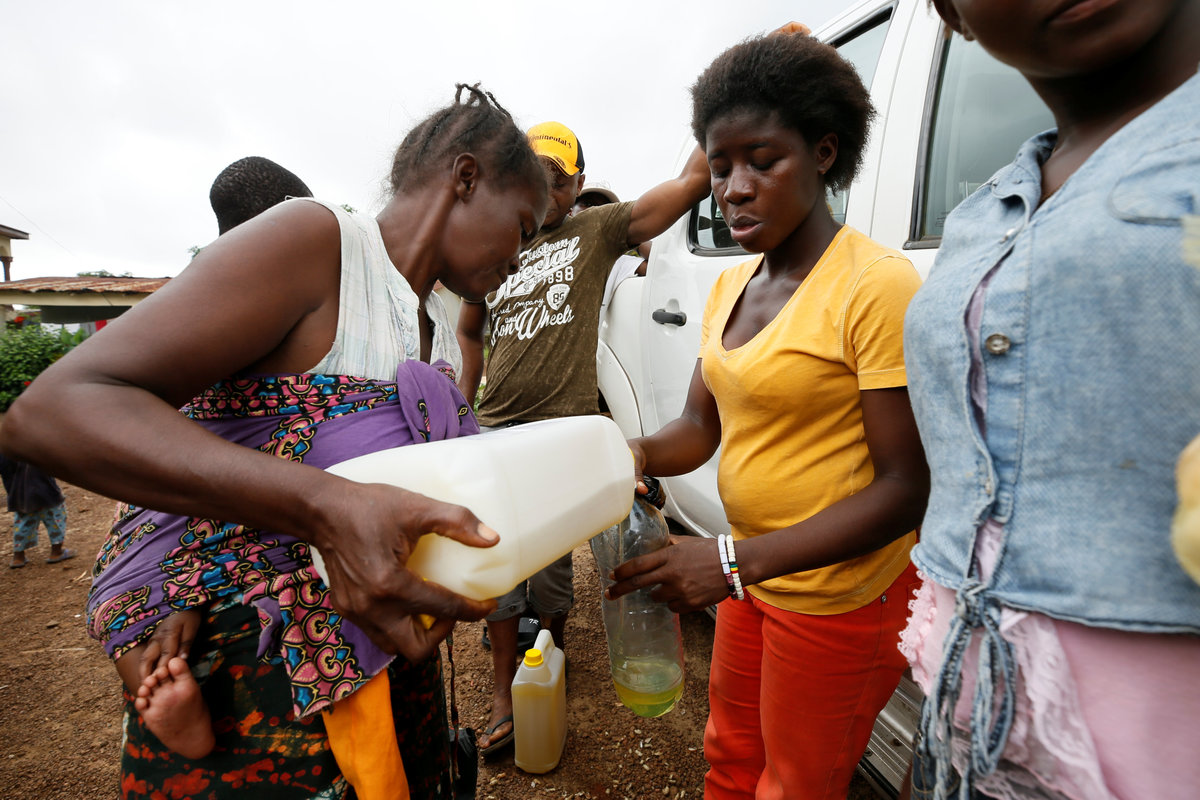 Displaced victims of the flash flood after the mudslide are seen sharing vegetable oil at a world food programe distribution at Pentagon, Regent town, Sierra Leone August 18, 2017. REUTERS/Afolabi Sotunde
