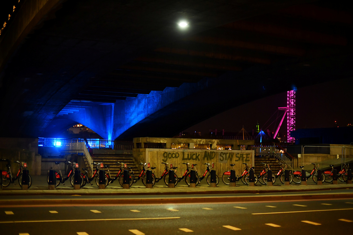 A sign is seen under a quiet Waterloo during the early hours, as the city at night is deserted like never before while the coronavirus disease (COVID-19) lockdown continues, in London, Britain April 22, 2020. Picture taken April 22, 2020. Picture taken with a slow shutter speed. REUTERS/Dylan Martinez