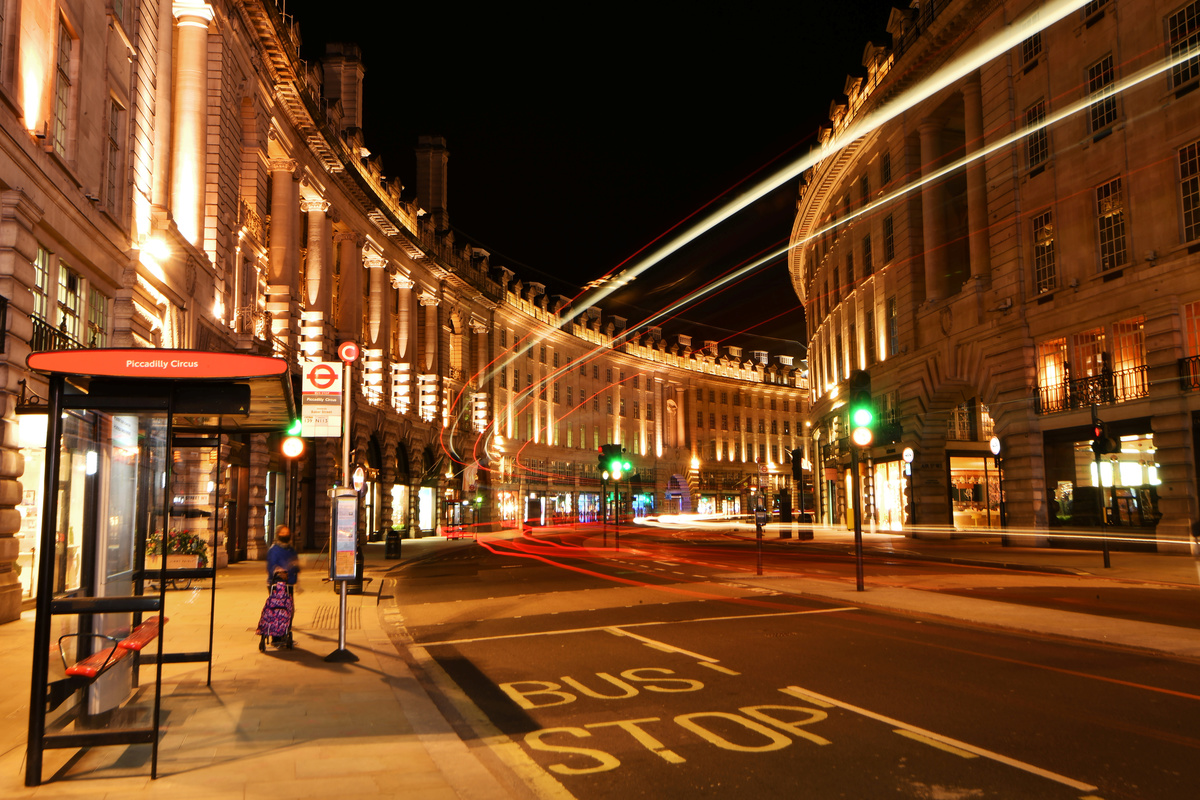 A solitary bell tolls, usually inaudible above the din, echoing along John Nash's elegant Regent Street. Empty red bus follows empty red bus.