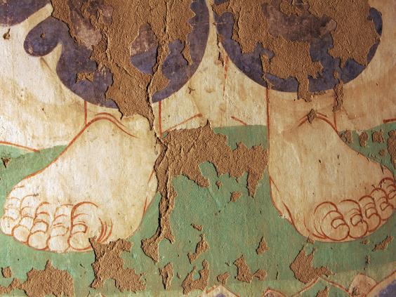 Some of the paintings, rendered on a base of mud and grass, are partly detached from the rock face, and enormously vulnerable to humidity or earthquakes. Different kinds of grout were extensively tested before one was chosen to fill the gaps.