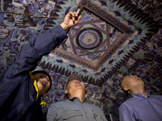 Later, they are guided through a selection of the 40 caves that are open to the public, forbidden to take photographs in case their camera flash damages the frescoes.