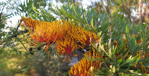 Silky oak is drought-tolerant. In dry times they often flower a bit later than their usual October blooming, providing a big splash of colour in otherwise drab and difficult years.