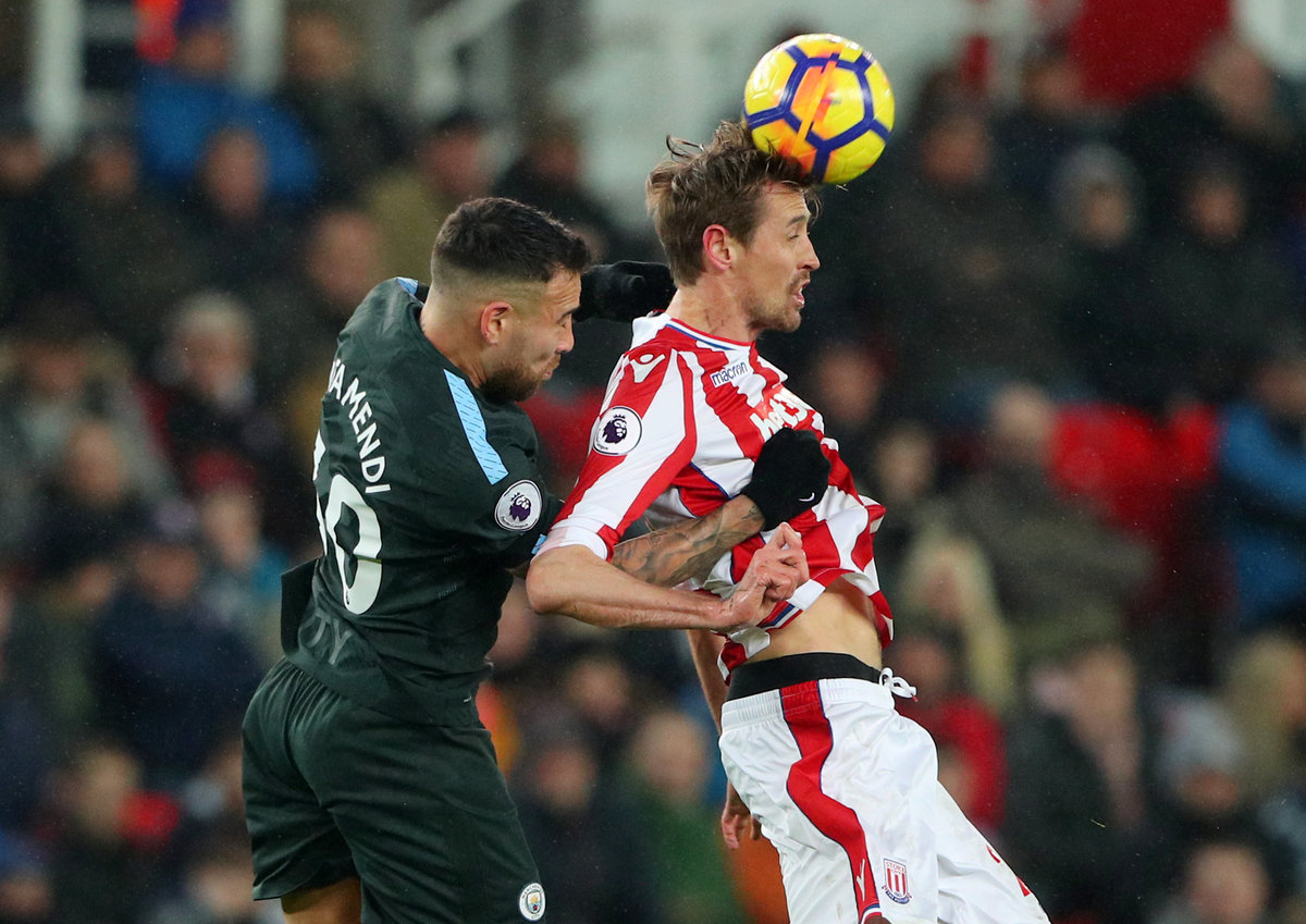 Soccer Football - Premier League - Stoke City vs Manchester City - bet365 Stadium, Stoke-on-Trent, Britain - March 12, 2018 Manchester City's Nicolas Otamendi in action with Stoke City's Peter Crouch REUTERS/Hannah McKay