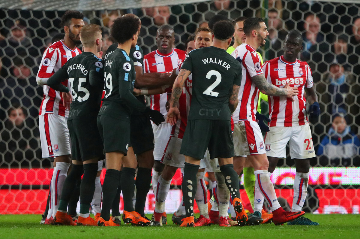 Soccer Football - Premier League - Stoke City vs Manchester City - bet365 Stadium, Stoke-on-Trent, Britain - March 12, 2018 Players from both sides clash REUTERS/Hannah McKay