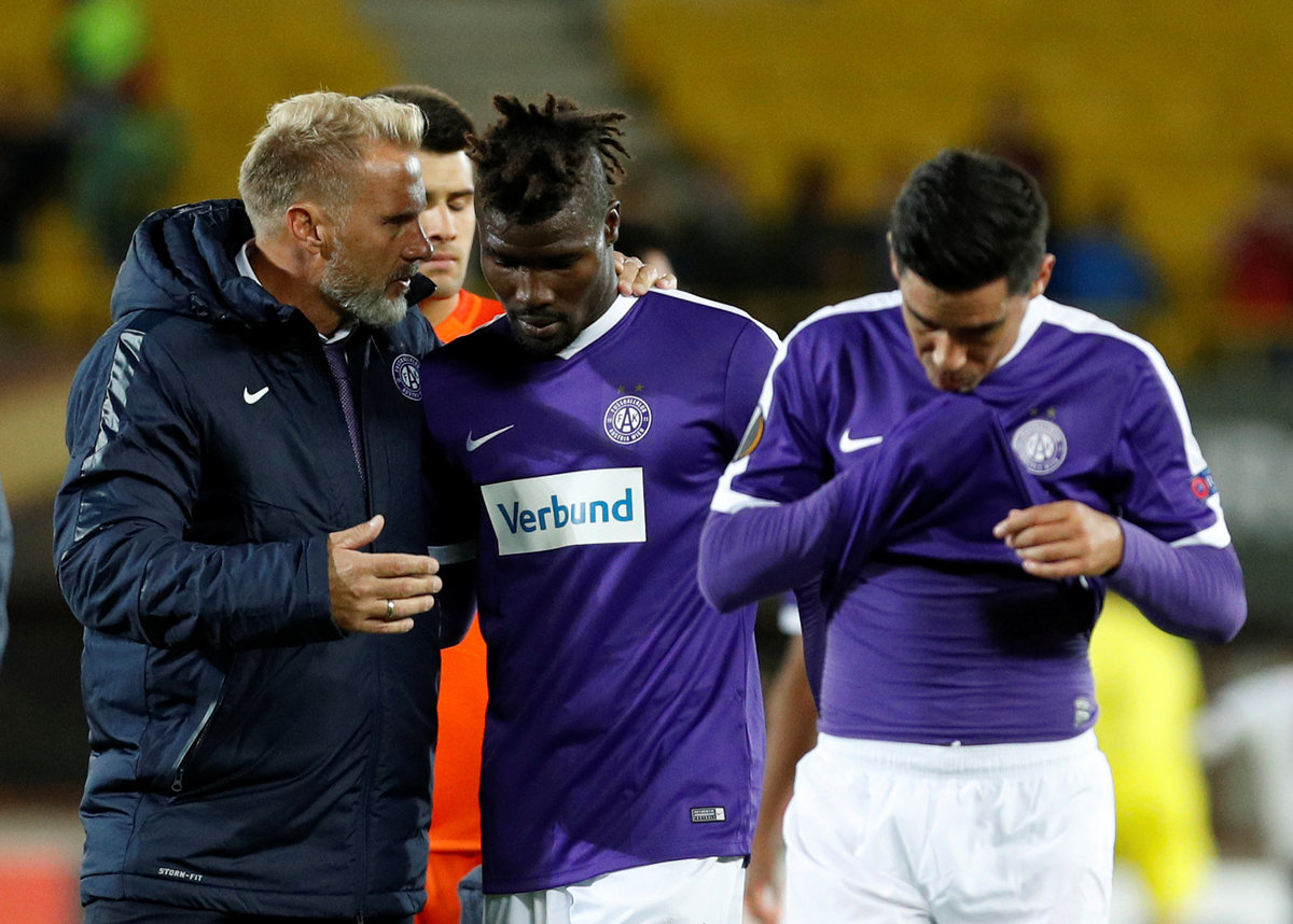 Soccer Football - Europa League - FK Austria Wien vs AC Milan - Austria Arena, Vienna, Austria - September 14, 2017 Austria Vienna coach Thorsten Fink and Abdul Kadiri Mohammed (C) look dejected after the match REUTERS/Heinz-Peter Bader