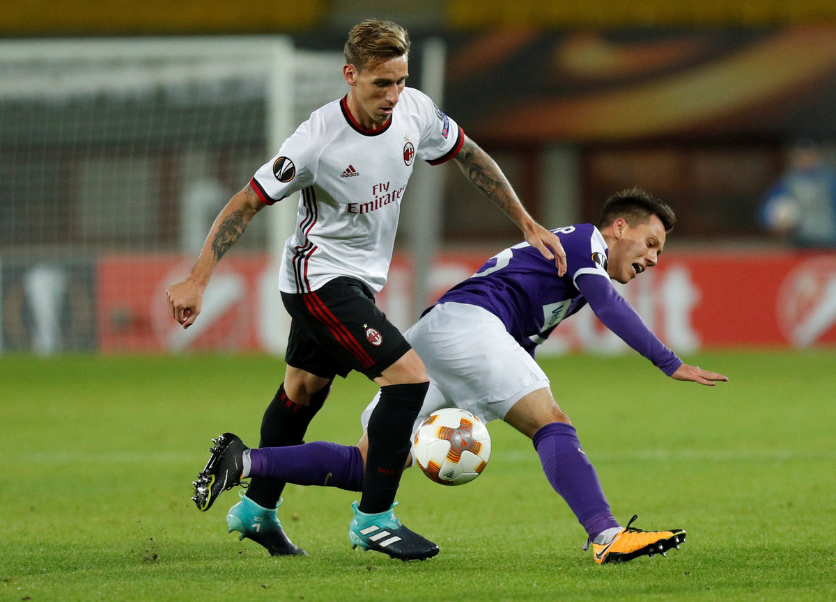 Soccer Football - Europa League - FK Austria Wien vs AC Milan - Austria Arena, Vienna, Austria - September 14, 2017 AC Milan's Lucas Biglia in action with Austria Vienna's Dominik Prokop REUTERS/Heinz-Peter Bader