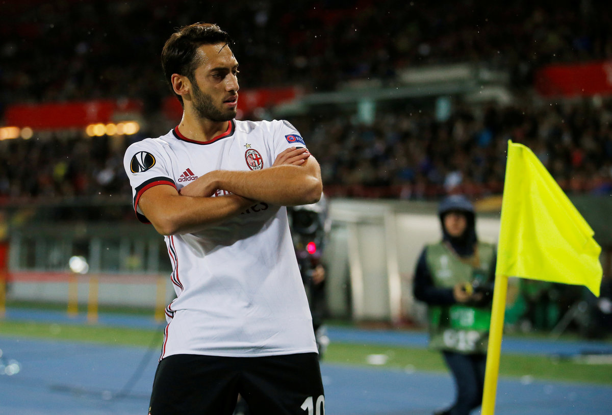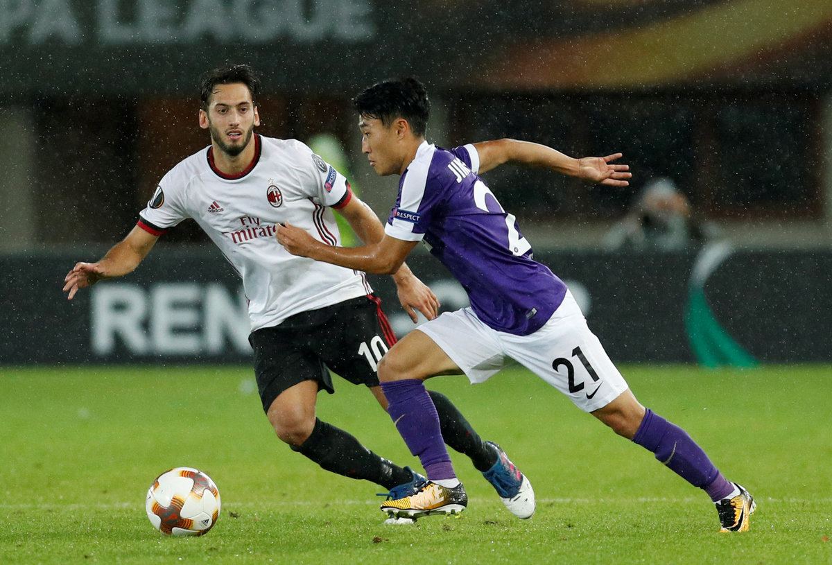Soccer Football - Europa League - FK Austria Wien vs AC Milan - Austria Arena, Vienna, Austria - September 14, 2017 AC Milan's Hakan Calhanoglu in action with Austria Vienna's Jinhyun Lee REUTERS/Heinz-Peter Bader
