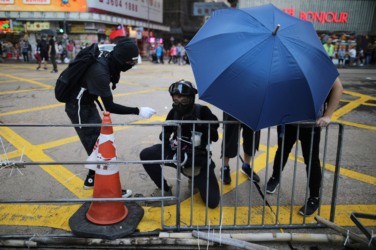 Some protesters erected road barricades using public garbage bins and water-filled plastic barriers used for traffic control and security.