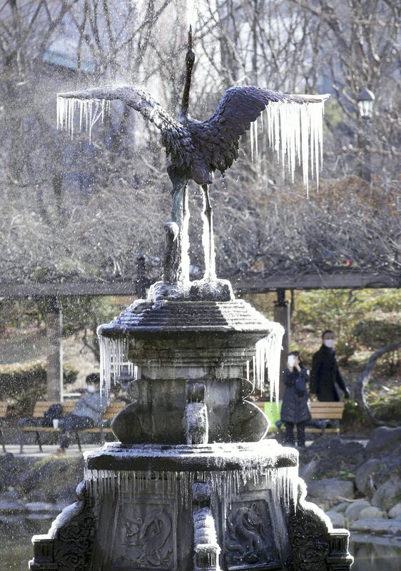 Long icicles hang from a crane-shaped fountain in Hibiya Park in Chiyoda Ward, Tokyo, on Wednesday, catching the eyes of passersby. Wednesday was the first day of Daikan, the coldest of the 24 seasonal divisions of the traditional calendar. The mercury fell to around zero in central Tokyo early in the morning. The Japan Meteorological Agency says the temperature is forecast to rise to 10 C or more in the Kanto region later this week.