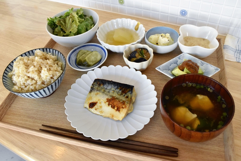 The set featured grilled miso-marinated mackerel. It also came with miso soup and seven small side dishes, such as simmered yugao gourds, potatoes stewed in cream and eggplants in balsamic vinegar. Nutritionally balanced, the meal was satisfying despite the small servings of each dish.