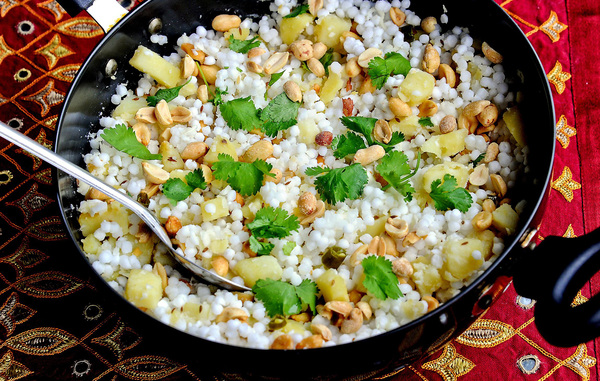 In my trial-and-error days of making the sabudana (translates to tapioca in Hindi), I found that if the pearls were soaked overnight in plenty of water, they were soft the following day, but they almost lost their round shape and ended up as one big gummy mass when cooked. These days I soak them overnight with just enough water to cover the pearls completely to get the perfect texture and shape.