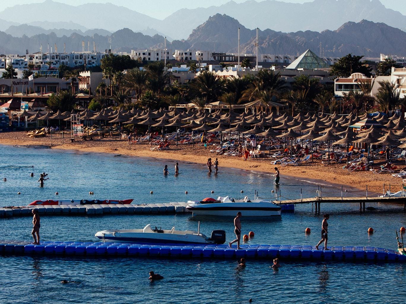 At the pool of the Delta Sharm Resort in Sharm el-Sheikh, Taylor Swift’s “Blank Space” blares over the speakers while the guests eat lunch. Some splash through the blue water to the swim-up bar, or lie on the loungers soaking up the early November sun, with midday temperatures easily exceeding 30 degrees even this late in the year.