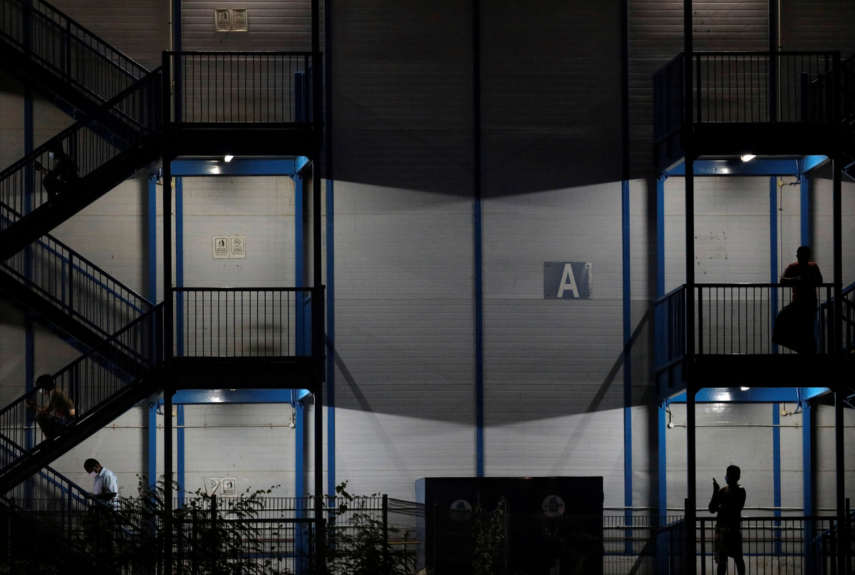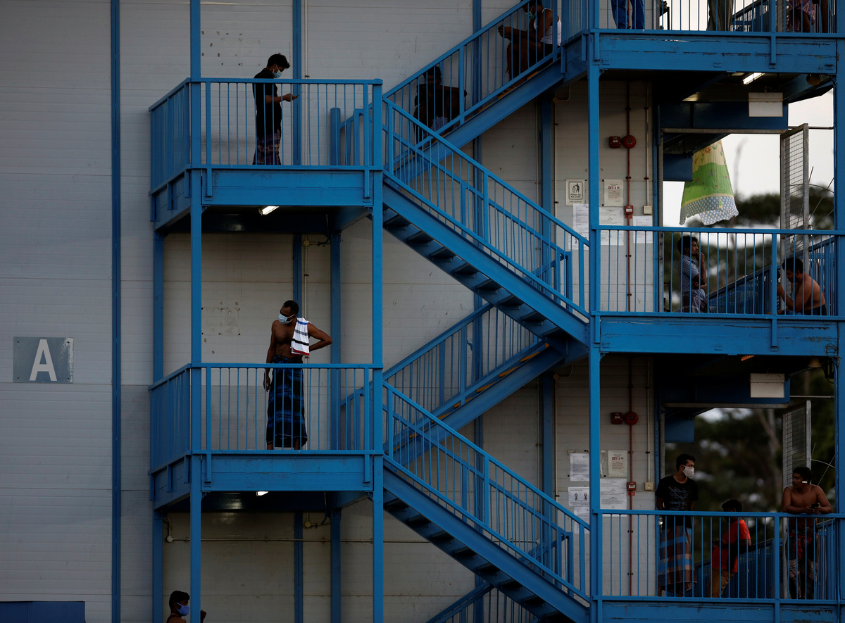 Migrant workers are pictured standing outside their dormitory rooms at Cochrane Lodge II, which was declared an isolation area due to the outbreak of coronavirus (COVID-19), in Singapore April 16, 2020. REUTERS/Edgar Su