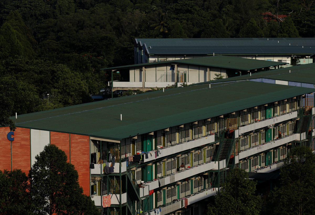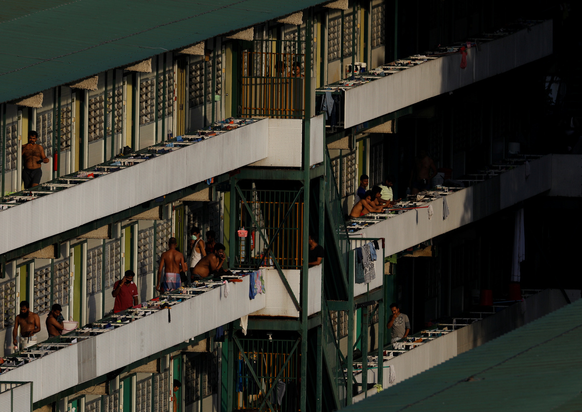 Migrant workers are pictured outside their rooms at North Coast Lodge, during the outbreak of coronavirus (COVID-19), in Singapore April 16, 2020. REUTERS/Edgar SuA view of Cochrane Lodge II dormitory for migrant workers, which was declared an isolation area due to the outbreak of coronavirus (COVID-19), in Singapore April 16, 2020. REUTERS/Edgar Su