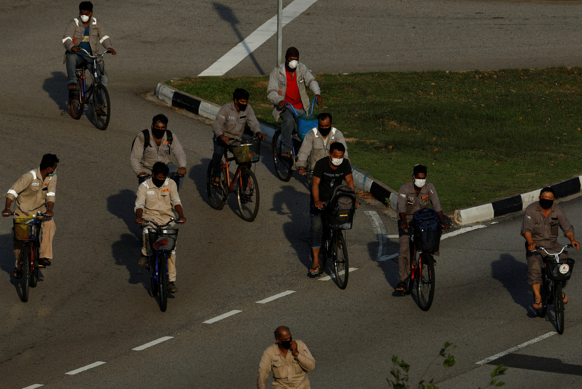 Migrant workers ride back to their dormitories after work, during the outbreak of coronavirus (COVID-19), in Singapore April 16, 2020. REUTERS/Edgar Su