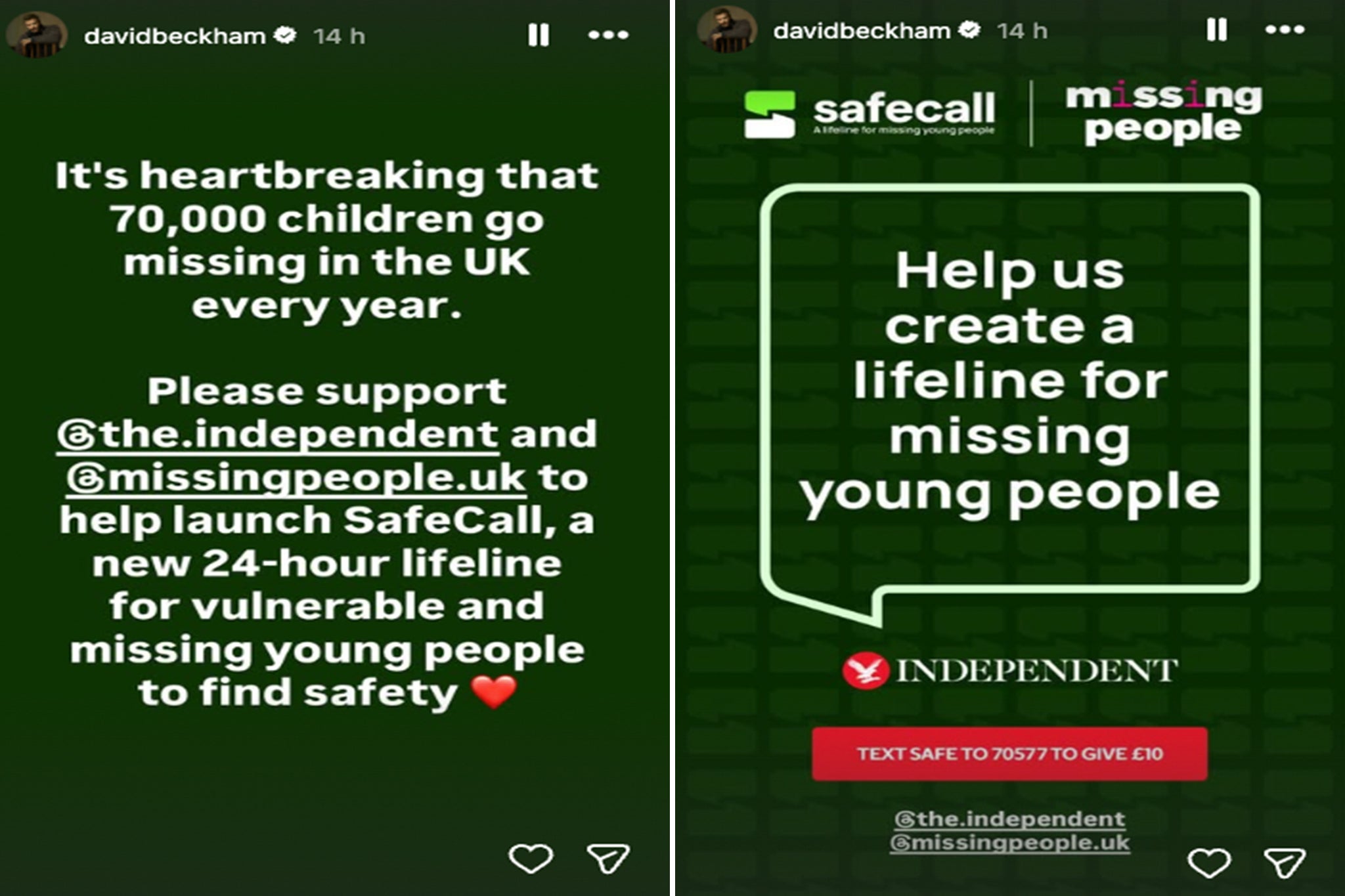 Posting to his 88 million Instagram followers, the former England captain wrote: “It’s heartbreaking that 70,000 children go missing in the UK every year. Please support The Independent and Missing People UK to help launch SafeCall, a new 24-hour lifeline for vulnerable and missing young people to find safety.”