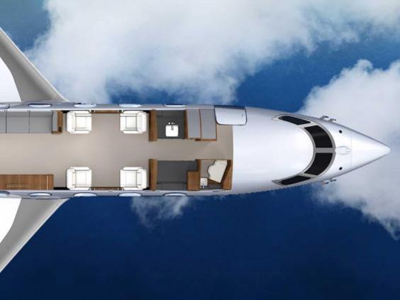 Inside, the jet can be designed with a bespoke floorplan to include conference spaces and compartments. It features handcrafted seats, 26-inch widescreen TVs, a convection oven and porcelain dinnerware.