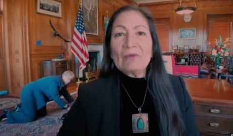 Secretary Haaland laughed and said: “We don’t have people sort of sneaking around, so yes I know who that is, and thank you for making light of it.”