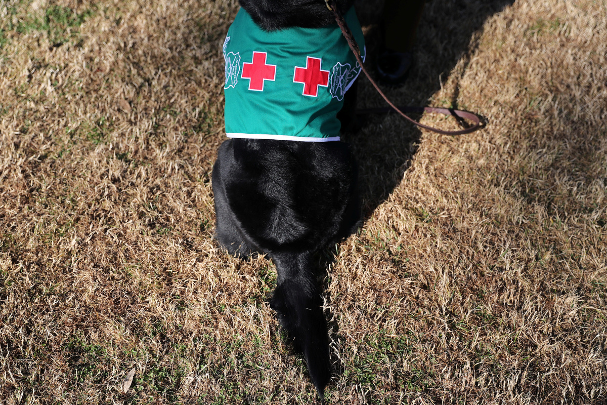 A team of Golden Retrievers and Labradors sit when they smell the virus and get a treat. The canines sport green "biodetector" jackets with a red cross.