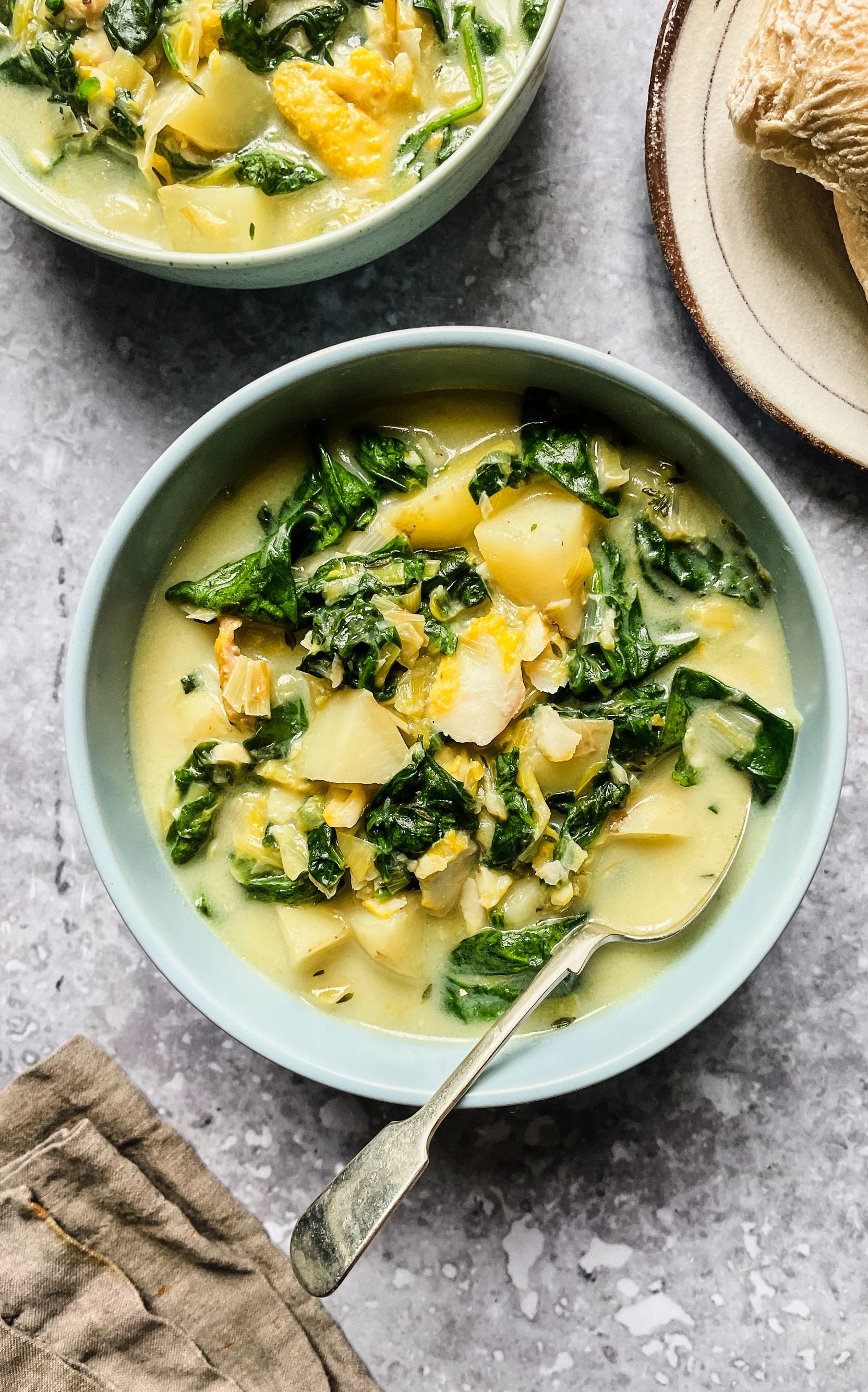 3. Gently place the smoked haddock into the pan and simmer for 5-6 minutes, until it flakes easily. Lift the fish out, break it into chunks, and return to the soup.
