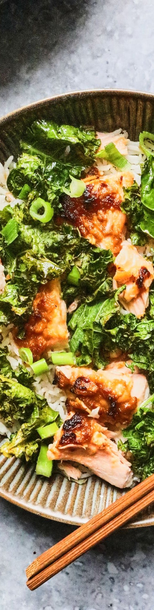 5. Serve the salmon and crispy kale over bowls of rice, topped with spring onions.